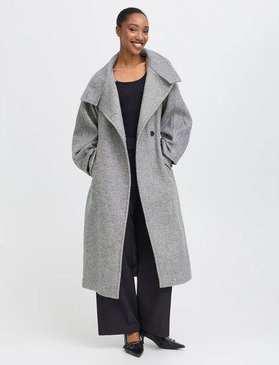 Denna långa kappa har en sofistikerad silhuett med en hög hals och ett knytbälte som ger en smickrande passform. Knappdesignen och sidfickorna tillför funktionell elegans.