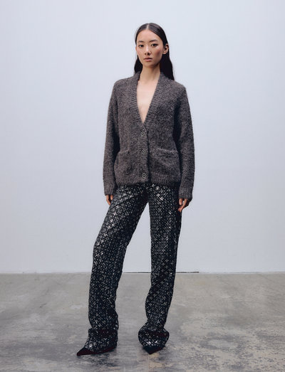 Den här koftan har en mjuk textur och är ett bekvämt och stilfullt lagerplagg. Den har en V-ringning och fina blomformade knappar som ger en elegant touch. Designen kompletteras med praktiska framfickor.