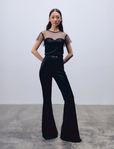 Dessa utsvängda jerseybyxor erbjuder en bekväm passform och en touch av elegans. De har en distinkt stigbygelspänne i midjan, vilket ger en unik och stilfull detalj till designen.