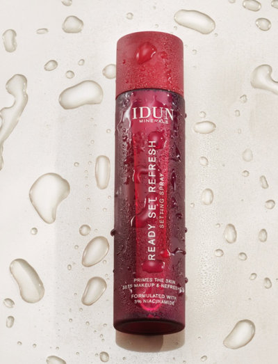 Ready set refresh. en all-in-one ultralätt face mist som förbereder, fixerar makeup och återfuktar huden med en ”glowy” finish. idun minerals ready set refresh setting spray med sin viktlösa formula får din makeup att sitta bättre och längre och ger en omedelbart återfuktad och uppfriskande effekt. berikad med glycerin som låser in fukt i huden och niacinamid (3%) som stärker hudbarriären, ökar hudens elasticitet och förbättrar hudens utseende. denna multifunktionella produkt håller din hud i balans och kan användas som primer för att återfukta huden innan din bas, mellan olika steg i din makeuprutin och som avslutande finish för att jämna ut, ta bort den pudriga looken och fixera makeupen. den smidiga storleken på 100 ml gör det enkelt att ta med on the go, så varför inte ha en i badrumsskåpet, en i väskan och en framför datorn för en återfuktad och strålande känsla under hela dagen.