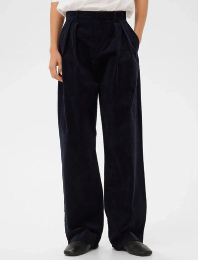 Dessa byxor är designade med en smickrande silhuett med vida ben och erbjuder en bekväm och stilfull passform. De främre veck ger en touch av sofistikering, vilket gör dem lämpliga för både avslappnade och mer uppklädda tillfällen.
