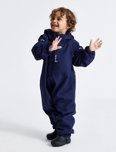 Hardshell coverall for smaller children, made of a durable & waterproof material, taped seams, to hold through all the childs outdoor activities. The material breathes and emits excess heat. Growth cuffs in sleeves and leg ends for another season.