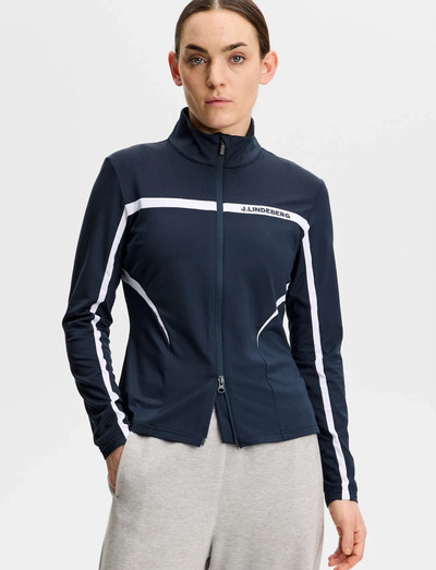 GolfDenna midlayer-jacka har sportiga ränder längs ärmarna och bröstet, vilket ger en strömlinjeformad silhuett. Den fullständiga dragkedjan ger justerbar ventilation, medan den höga kragen ger extra värme. Perfekt för lager-på-lager-look under kyligare väder.