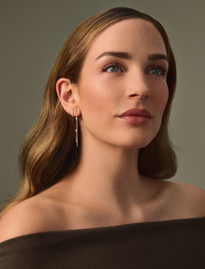 Dessa kedjeörhängen är tillverkade av 22 karats guldpläterat sterlingsilver och erbjuder en tidlös och raffinerad estetik. Designen har en delikat satinfinish och visar upp två infattade cubic zirconia-stenar, var och en elegant inramad. Dessa örhängen är perfekta för att addera en touch av diskret elegans till varje ensemble och passar vackert ihop med andra smycken.