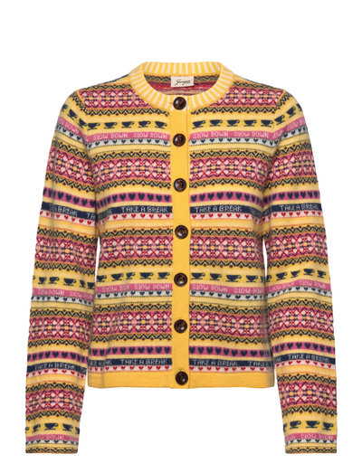 Denna cardigan är stickad i en mjuk ullblandning och har ett charmigt Fair Isle-mönster. Den knäpps fram med kontrasterande knappar, och den klassiska passformen gör den perfekt för lager-på-lager. En rund halsringning fulländar detta plagg, som både ger värme och personlighet till varje outfit.