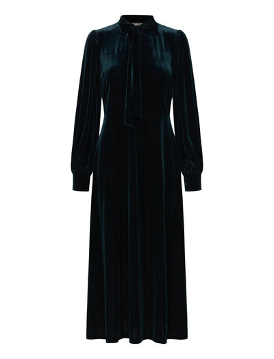 Denna klänning är tillverkad i mjuk sammet och har ett smickrande fall och en feminin silhuett. Den har en knytdetalj i halsen och långa puffärmar. Den är skuren i midjan och faller ner i en vadlång kjol. Denna klänning passar både till vardags och till festligare tillfällen.