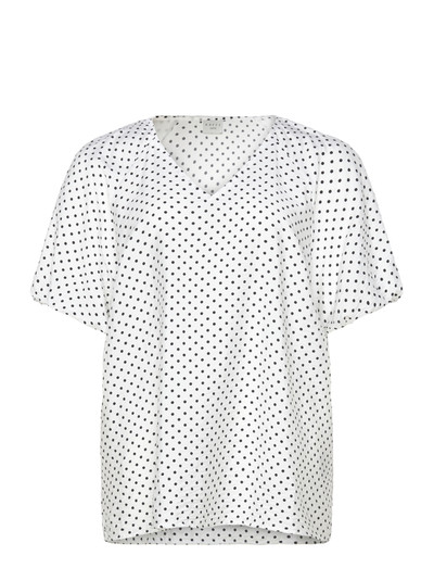 En klassisk V-ringning och korta ärmar definierar denna blus, vilket gör den till ett mångsidigt tillskott till varje garderob. Det genomgående mönstret ger en touch av visuellt intresse, perfekt för att klä upp eller ner.