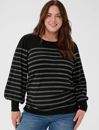 Horisontella ränder ger en touch av visuellt intresse till denna bekväma stickade tröja. Den avslappnade passformen och de lätt puffade ärmarna skapar en smickrande silhuett. En mångsidig tröja som kan kläs upp eller ner.