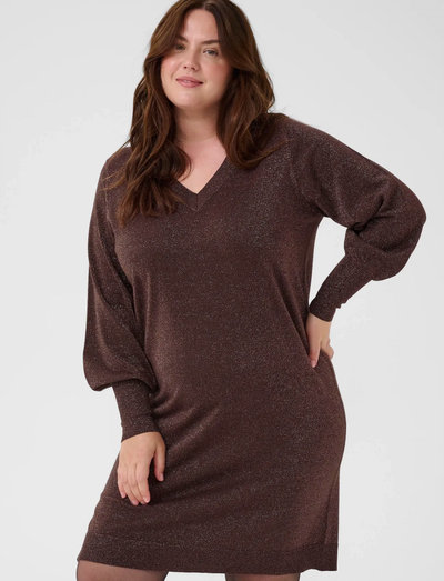 Denna stickade klänning definieras av en V-ringning och långa, voluminösa ärmar. Den raka passformen gör den till ett bekvämt val för vardagsbruk, som enkelt kan kläs upp eller ner.