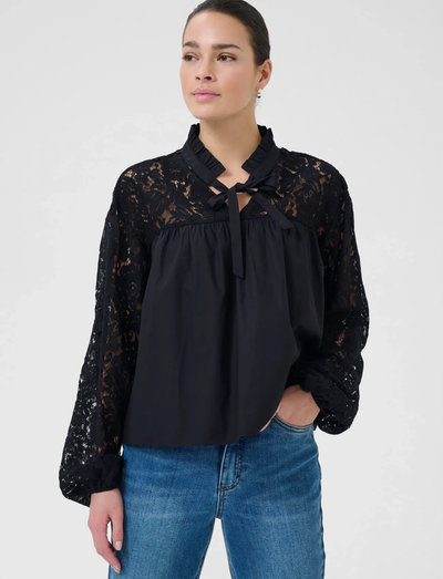 Denna blus har fina spetsdetaljer på ärmarna och oket, vilket ger en elegant touch. De långa ärmarna och den lösa passformen säkerställer en bekväm och avslappnad silhuett.