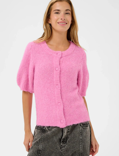 Denna kortärmade cardigan har en mjuk textur och erbjuder ett bekvämt och stilfullt lageralternativ. Den är designad med en klassisk rund hals och knäppning framtill, vilket gör den lätt att bära och mångsidig för olika outfits.