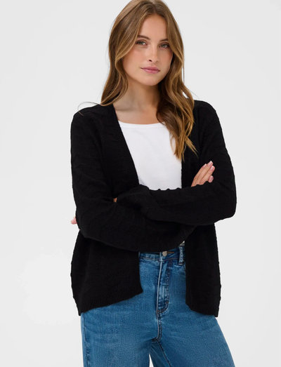 Denna korta cardigan har en öppen front och en avslappnad silhuett. Den texturerade stickningen ger ett visuellt intresse, vilket gör den till ett mångsidigt lagerplagg.
