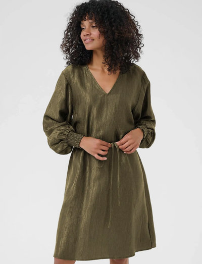 Denna korta klänning är tillverkad med en subtil glans och har långa ärmar med elastiska muddar. Ett knytband i midjan framhäver silhuetten. V-ringningen ger en elegant touch, vilket gör den lämplig för olika tillfällen.