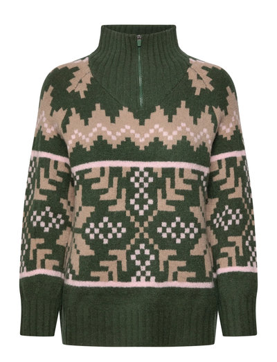 Den här stickade tröjan har ett mönster inspirerat av norra Norge och ger exceptionell värme och komfort. Den ullsyntetiska blandningen är otroligt mjuk, medan de voluminösa ärmarna och den något oversized passformen skapar en mysig känsla. En hög krage, halv dragkedja i halsen och ribbade fållar och muddar fulländar den här garderobsfavoriten.