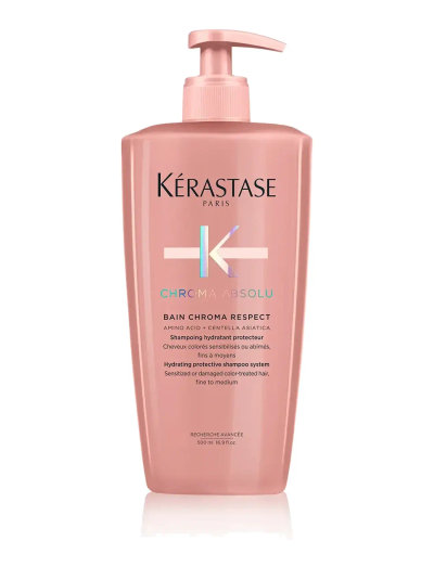 Kérastase Bain Chroma Respect är ett skonsamt återfuktande och beskyddande schampo för alla typer av sensibiliserat eller skadat, tunt till medeltjockt färgbehandlat hår. Denna ljusrosa, krämiga gel är berikad med en kombination av aminosyra och centella asiatica som återfuktar håret samtidigt som det stärker hårfibrerna för att skydda färgen från att blekna. Färgen livas upp med 74 % mer strålande glans*. 92 % av färgens intensitet är bevarad även efter 6 veckor**. *INSTRUMENTELLT TEST **INSTRUMENTELLT TEST: BAIN CHROMA RESPECT + FONDANT CICA CHROMA Våra schampo flaskor är tillverkade av 95 % återvunnen plast.