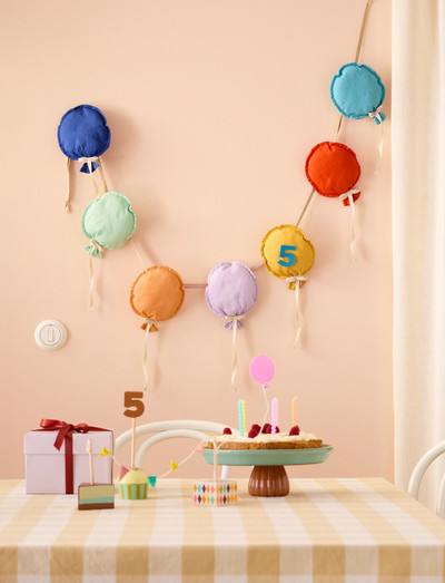 Vissa saker är värda att plocka fram år efter år – som den här födelsedagsgirlanden, formad som en rad ballonger. Den är tillverkad i bomull med mjuk polyesterfiberfyllning och är tänkt att vara en del av dina firanden under många år framöver. En av ballongerna har en plats där du kan fästa siffran för det år som firas – siffrorna fästs med kardborre, vilket gör det enkelt att uppdatera varje år.