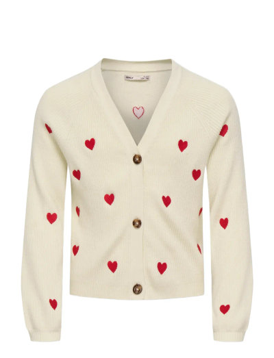 Den här koftan är ett snyggt och bekvämt val för alla tillfällen. Den har en klassisk v-ringning, långa ärmar och en knappstängning. Koftan är gjord av ett mjukt och bekvämt stickat tyg och är prydd med ett fint hjärtmönster.