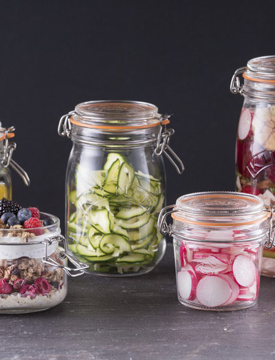 Kilners ständigt populära konserveringsburkar i glas är både snygga framme på köksbänken och samlingsbara. Burken har ett praktiskt lufttätt bygellock och deras logga finns präglad på fronten av burken. Dessa burkar är perfekta för konservering och förvaring av torr mat som ris, mjöl, te och kaffe. Kilners burkar finns i flera storlekar och modeller beroende på vad du vill fylla dem med. Ta till vara på trädgårdens skörd och koka en god sylt eller marmelad att fylla burken med som du sedan serverar med nybakade scones.