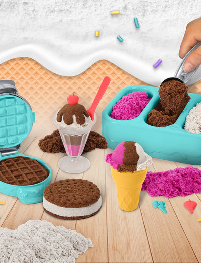 Med leksetet Kinetic Sand Ice Cream Treats får du glädjen av en glassbar rakt in i ditt hem! Barnen kan använda de 6 verktygen med glassmotiv för att skopa, forma och skapa sina egna glassgodisbitar. Blanda den rosa, bruna och vita kinetiska sanden för att hitta på nya färger och smaker, och lägg sedan till den sista touchen med de roliga tillbehören. Detta lekset uppmuntrar till kreativitet, fantasi och finmotorisk utveckling genom taktil, sensorisk lek. The One and Only Kinetic Sand är tillverkad av naturlig sand och klibbar fast vid sig själv, vilket garanterar kladdfritt skoj! Skapa om och om igen och låt Kinetic Sand flöda genom dina händer - det är så tillfredsställande att du inte kommer att kunna lägga det ifrån dig! Inte bara är leksetet ett bra alternativ till modellera för konst och hantverk, utan det är också ett bra komplement till ditt hantverksbord, barnens aktivitetstid och montessorileksaker! Perfekta coola leksaker för flickor och pojkar för att uppmuntra självständigt och fantasifullt byggande. För mer kul med Kinetic Sand kan du fylla på ditt Kinetic Sand-lekset med Kinetic Sand-grovpåsar med färgad sand (säljs separat).