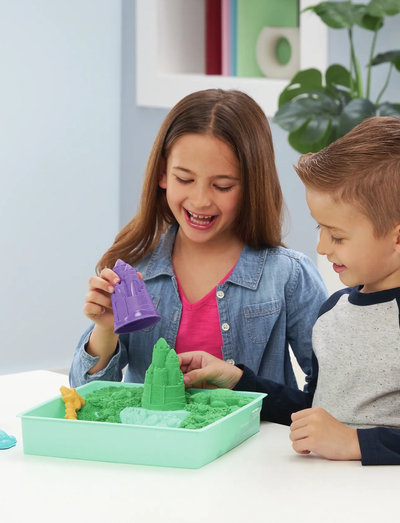 Skapa dina egna sandlådeäventyr med Kinetic Sand Sandbox Set. Kinetic Sand är den ursprungliga magiska, formbara och fascinerande sensoriska sanden. Den rinner genom dina händer och torkar aldrig ut så att du kan leka om och om igen. Med Sandbox Set kan du njuta av sandlådelekar året runt. Den unika Kinetic Sand-formeln gör det enkelt att forma, klämma och gjuta allt du kan tänka dig. Forma slott, krabbor och sköldpaddor med 454 g grön Kinetic Sand och använd det medföljande spadverktyget för att gräva, skopa, flöda och forma. Detta Kinetic Sand-set innehåller även en sandlåda för innesluten lek, perfekt för inomhusbruk. Kläm, skär, skopa, forma - de kreativa möjligheterna är oändliga med Sandbox Set. Skapa olika kreationer om och om igen och låt Kinetic Sand flöda genom dina händer - det är så tillfredsställande att du inte kommer att kunna lägga det ifrån dig. Kinetic Sand är tillverkad av naturlig sand. Leksetet är inte bara ett utmärkt alternativ till modellera för konsthantverk, det är också ett utmärkt komplement till pysselbordet, barnens aktivitetstid och Montessori-leksaker. Perfekta coola leksaker för flickor och pojkar som uppmuntrar till självständig lek och fantasi. För mer kul med Kinetic Sand kan du fylla på ditt Kinetic Sand-lekset med Kinetic Sand-säckar med färgad sand (säljs separat).