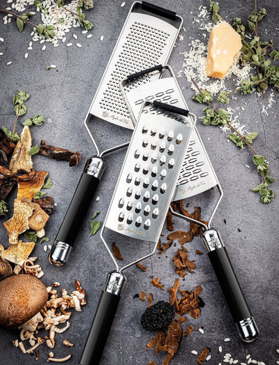 Ett set med 3 delar från Laguiole Style de Vie. Varje rivjärn har sin egen funktion, vilket gör detta set mycket mångsidigt. Det fina rivjärnet används till exempelvis citrus, choklad, hårdostar och kryddor, medan det extra grova rivjärnet passar bäst till potatis, kål, gurka, pumpa, ost, korv och äpple. Bandvarianten är idealisk för att riva kryddor, citrus, ost, ingefära, kokos och choklad. Alla tre rivjärnen har en laserskuren bladyta i rostfritt stål. Rivjärnen skärs med laserteknik, vilket säkerställer att rivjärnen är mycket vassa. Berika din kulinariska repertoar med detta mycket funktionella 3-delade gallerset! Perfektion börjar med att använda rätt verktyg! Förpackad i en elegant trälåda, vilket gör detta set också bra att ge bort som present.
