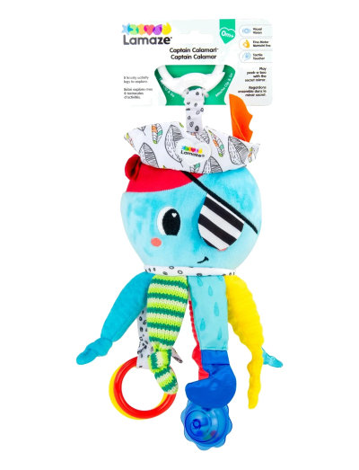Ohoy kompis! Träffa babyns första skeppskompis, Lamazes Captain Calamari. Den här bläckfiskpiraten har åtta aktivitetsben med knutar på, som är fantastiska att utforska. Captain har en dold spegel som hjälper till att lära ut självigenkänning och som det är roligt att leka tittut med. Babyn kan upptäcka hans skrynkliga hatt, roliga skallra och klickande ringar och få hjälp med att utveckla finmotoriken. Captain Calamari innehåller ett flerfunktionellt clips som är utformat för att fästa på sittvagnar eller blöjväskor så att han kan följa med dig överallt.