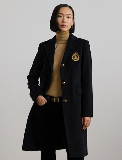 Denna kappa är tillverkad av en mjuk ullblandning med en touch av kashmir och har en rak passform som slutar strax ovanför knäet. Den är detaljerad med ett signaturvapenmärke på bröstet och vapenpräglade knappar, vilket ger en raffinerad touch till detta tidlösa plagg. Reverskragen och silhuetten med tre knappar förstärker dess klassiska utseende.