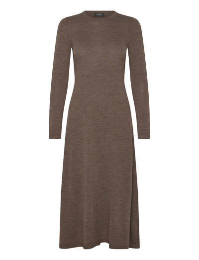 Denna klänning är tillverkad av mjuk merinoull och har en raffinerad silhuett med långa ärmar och en lätt utsvängd kjol. Den fina stickningen ger värme och ett mjukt fall, vilket gör den till ett mångsidigt val för olika tillfällen.