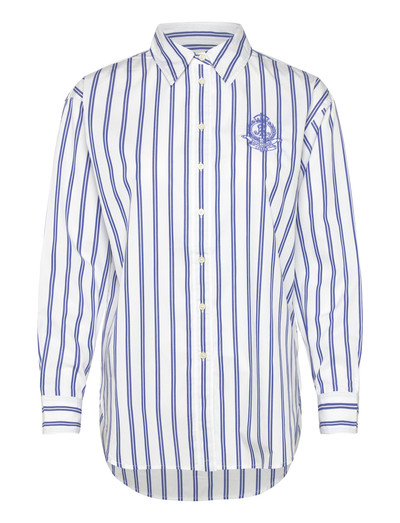 Denna långärmade skjorta har en garnfärgad broadcloth-väv, vilket ger en skarp och klassisk look. Designen förstärks av ett broderat emblem, vilket ger en distinkt touch till det randiga mönstret.