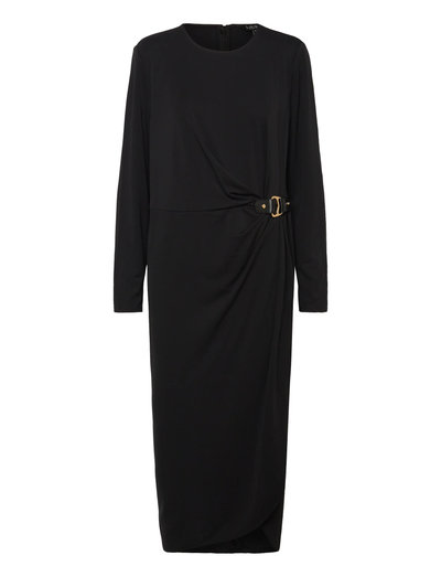 Denna klänning är tillverkad av mjuk, matt jersey och har en smickrande draperad silhuett. En glänsande metalldetalj i midjan ger en touch av sofistikering, vilket gör den perfekt för kvällsevenemang.