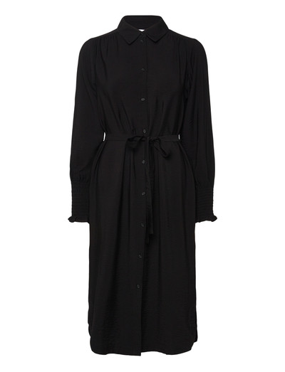 Denna skjortklänning har ett knytband i midjan för anpassad passform och erbjuder en blandning av klassisk stil och modern komfort. Designen har långa ärmar med smockade muddar och en helknäppt framsida.