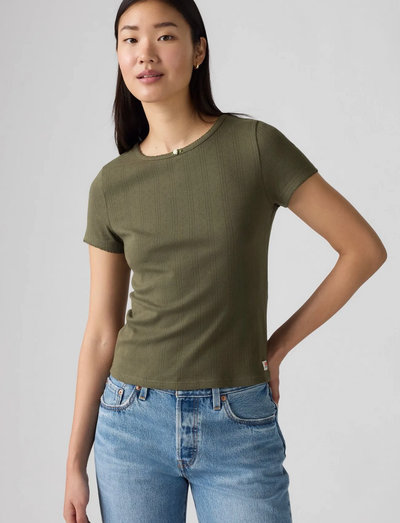 Den här Levi's pointelle-t-shirten är ett garderobsmåste. Den har en klassisk rund hals och korta ärmar. Det ribbade tyget ger en bekväm passform. En liten knappdetalj ger en touch av elegans.