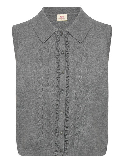 Denna stickade väst har en charmig volangdetalj framtill, vilket ger en touch av textur och visuellt intresse. Den kraglösa halsringningen ger en sofistikerad touch, vilket gör den till ett mångsidigt plagg för lager-på-lager eller att bära som den är.