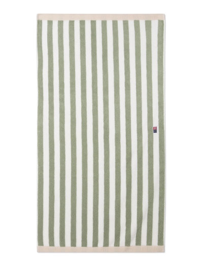 The classic block striped towel in vintage green, white and moonbeam brings a fresh, timeless aesthetic to your bathroom. Crafted from 100% high quality 600g ring spun cotton terry, this towel is both soft and highly absorbent. The sophisticated block stripe design features a folded contrast edge with jacquard text logo at top and bottom, while a woven Lexington logo at the lower front adds an authentic touch. Oeko-tex certified for your peace of mind.