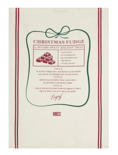 BomullAdd festive charm to your holiday kitchen with this delightful organic cotton kitchen towel featuring a charming Christmas fudge recipe print. Crafted from soft organic cotton twill in a cheerful white, red, and green color palette, this functional yet decorative towel combines practicality with seasonal style. The yarn-dyed side stripes add visual interest, while the printed fudge recipe makes it a conversation starter and helpful baking companion during the holiday season.