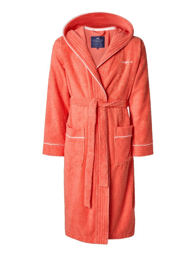 Relax in luxury with this coral fluffy and comfortable bathrobe in 340 gsm cotton blend. Its high absorbency, terry material, and hooded design make it perfect for lounging. With front pockets, chest embroidery, and Oeko-Tex certification, it’s both stylish and sustainable.
