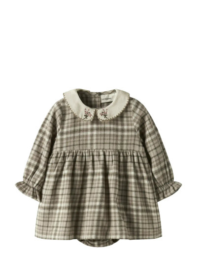 Denna klänningsbody har en klassisk vävd textur och är ett charmigt tillskott till varje barns garderob. Designad med långa ärmar och volangkant, säkerställer den en bekväm passform med knapp- och tryckknäppning. O-halsdesignen avslutas med fina broderier.
