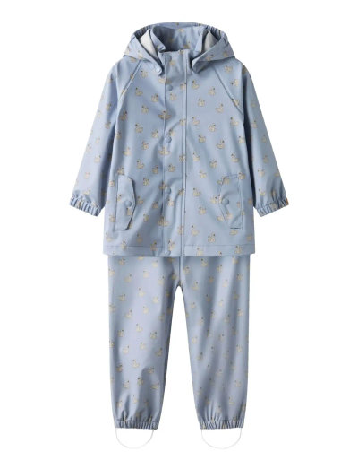 Den här Lil'Atelier regnset är perfekt för att hålla barn torra och bekväma på regniga dagar. Setet inkluderar en jacka och byxor, båda med ett roligt svanmönster. Jackan har en huva och en blixtlåsförslutning, medan byxorna har ett elastiskt midjeband och justerbara band i botten.