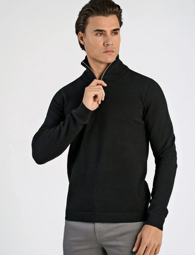 Den här halv-zip-tröjan är gjord av återvunnen stickad tyg. Den har en hög hals och en halv-zip-stängning. Tröjan är perfekt för lager på lager och kan bäras vid en mängd olika tillfällen.