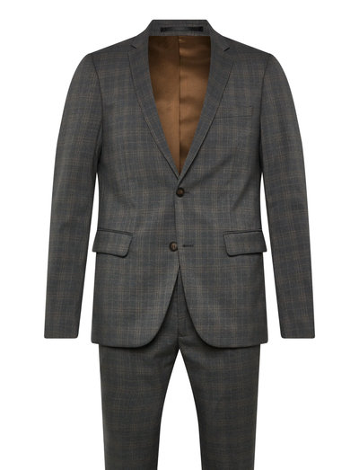 Denna kostym är ett raffinerat val för formella tillfällen och har ett subtilt rutmönster som ger djup till den klassiska designen. Den skräddarsydda passformen säkerställer en skarp silhuett, medan det högkvalitativa tyget ger komfort och hållbarhet.