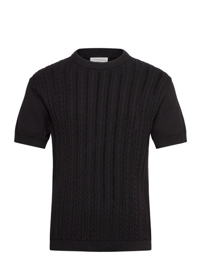 Stickad T-shirt tillverkad av 100% bomull. Bålen är kabelstickad medan ärmarna är släta. Det finns en liten logopatch längst ner till vänster.