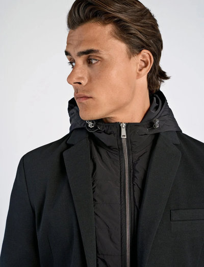 Denna blazer erbjuder en modern twist på en klassisk silhuett och har ett avtagbart inre lager med huva, vilket ger mångsidighet för varierande väderförhållanden. Tvåknäppningen och fickorna med lock bibehåller en traditionell look, medan den strömlinjeformade skärningen säkerställer en modern passform. Bär den som en fristående blazer eller med det extra lagret för extra värme och skydd.