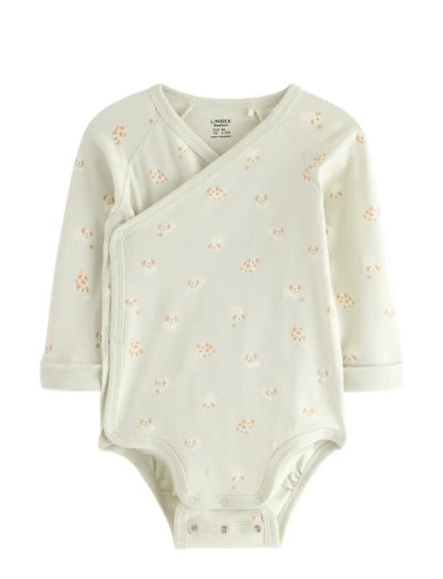Mjuk och stretchig bomull formar denna långärmade body. Omlottdesignen gör den enkel att klä på, medan Extended size-lösningen gör att barnet kan växa en storlek och fortfarande använda den.