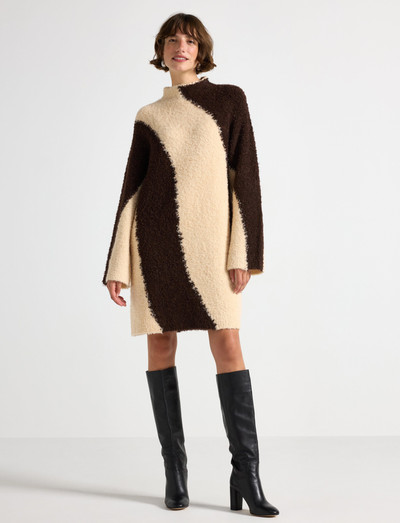 Boucléstickningen ger denna miniklänning en texturerad look. De långa ärmarna och den höga halsen gör den till ett bekvämt val för kyligare dagar.
