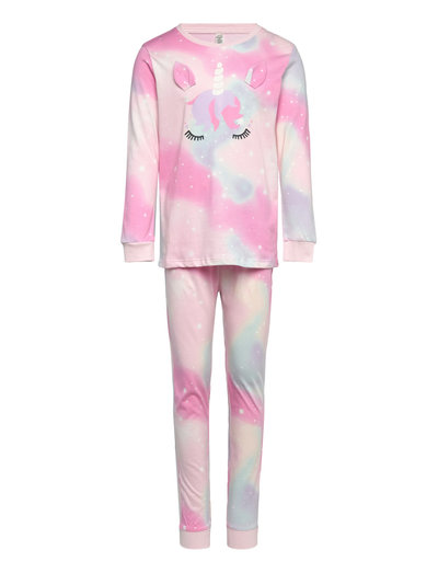 Detta mjuka pyjamasset består av en långärmad tröja och matchande byxor, vilket garanterar en bekväm nattsömn. Tröjan har en lekfull dinosauriedesign, medan byxorna är mönstrade för en extra rolig detalj.