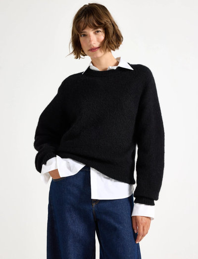 Denna fintstickade tröja är tillverkad i en mjuk ullblandning och har en avslappnad passform. Designen har en klassisk rund halsringning och subtilt voluminösa ärmar, vilket gör den till ett bekvämt men stilfullt val för vardagsbruk.