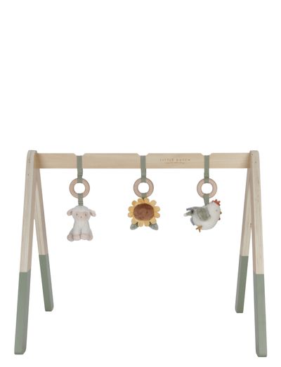 Up with those little arms! Curious babies will have a great time with this wooden baby gym. There are three different activity toys that provide entertainment, including a cheerful sheep, a cute chicken, and a colorful flower. The baby gym develops hand-eye coordination, improves motor skills, and stimulates the senses every time your little one reaches for one of the toys. WARNING! To prevent possible injury by entanglement, remove this toy when the child starts trying to get up on its hands and knees in a crawling position. Adult assembly required.