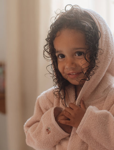 Omfamna ditt barn varsamt i den här badrocken och njut av de värdefulla stunderna av värme och närhet efter en lekfull dag. Badrocken är tillverkad av 100 % ekologisk bomullsfrotté och är otroligt mjuk och absorberande. Den är perfekt för att hålla ditt barn varmt och torrt efter badstunden. Badrocken är genomtänkt designad med ett säkert midjeband och en strategiskt placerad tryckknapp, vilket garanterar både rörelsefrihet och skön värme för ditt barn. Den härliga rosa badrocken Blossom är utsmyckad med charmiga broderier från Fairy Garden-kollektionen, med bedårande små blommor som för tankarna till en blommande trädgård.