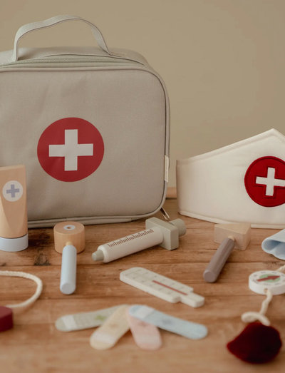 Doktor, kan du ta en titt? Med detta kompletta läkarset i trä är din lilla fullt förberedd att ta hand om patienter. Läkarväskan i tyg innehåller alla viktiga medicinska verktyg, såsom termometer, spruta, bandage, stetoskop och blodtrycksmätare. Till och med en läkarmössa ingår! Perfekt för fantasifulla rollspel och för att bekanta sig med läkarbesök. Vem är nästa patient?