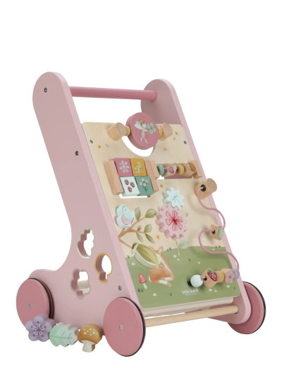Denna gåstol i trä erbjuder olika utmanande aktiviteter som stöder utvecklingen av ditt barns motoriska färdigheter. Utmana ditt barn med de många aktiviteterna på den här vackert dekorerade gåstolen. Det finns 8 aktiviteter att upptäcka och bemästra. Med sin robusta design är gåstolen lämplig för barn från 12 månader och äldre som är redo för sina första steg. Förbered dig på entusiastisk uppmuntran när ditt lilla barn navigerar genom huset med den här gåstolen. Gummihjulen gör inga märken på golvet och är säkra att använda inomhus. Montering krävs av vuxen.